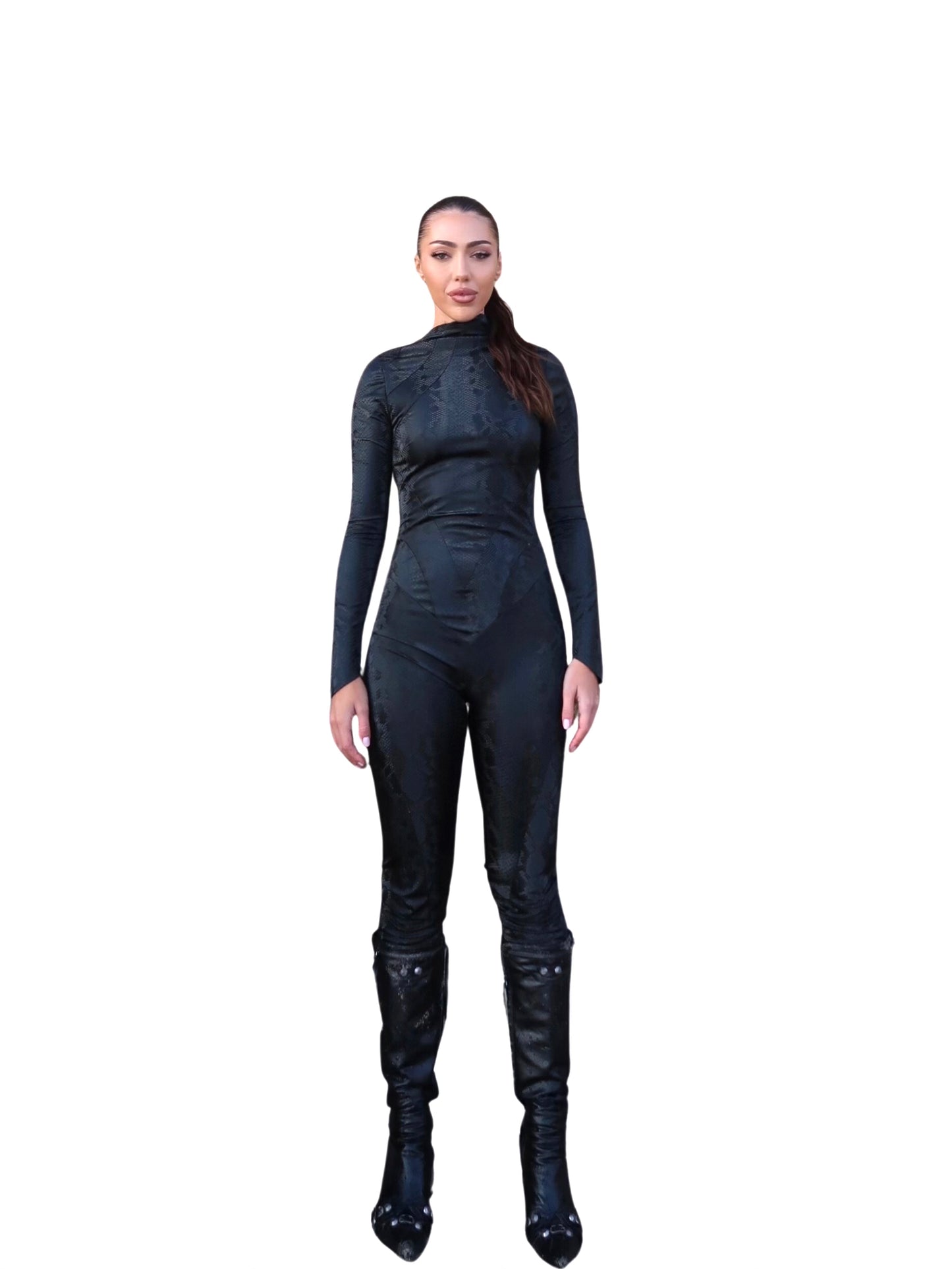 Our Serpentine Asymmetric High Neck Jumpsuit embodies the essence of our Spring Summer 2023 collection, featuring innovative lines, cuts, textures, and dimensional designs. It combines geometrical cuts and siren figure elements, creating a captivating ensemble. Made from a stretch fabric with 3D snake scales/definition, the jumpsuit offers a skin-tight fit. It features long sleeves, a high neck turtleneck with an asymmetric top cut, and geometric lines/cuts throughout. The v-shaped mermaid tail figure adds an extra touch of sophistication. Designed for easy wear, the jumpsuit includes an invisible back zipper. Embrace the allure of the Serpentine Asymmetric High Neck Jumpsuit and experience the perfect fusion of style and sophistication in our SS23 collection.