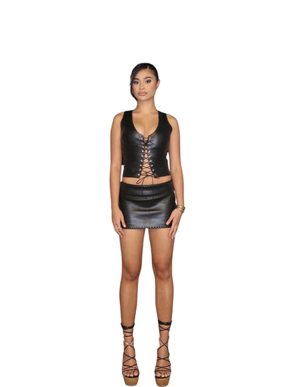 SIREN THE BRAND FW22 Crest Halter Vest features a halter-style neckline, back asymmetrical cut straps, and front corset lacing closure. This vest combines bold design with functionality. The front showcases waist illusive cuts, while the back features siren tail-inspired cuts and double stitching outlining. Easy wear is ensured with a side invisible zipper opening.This concept is infused with a futuristic vision of its heroine aesthetic blending in an ultra feminine silhouette approach. Enhancing shape, lift & support while catapulting in her style and uniqueness.